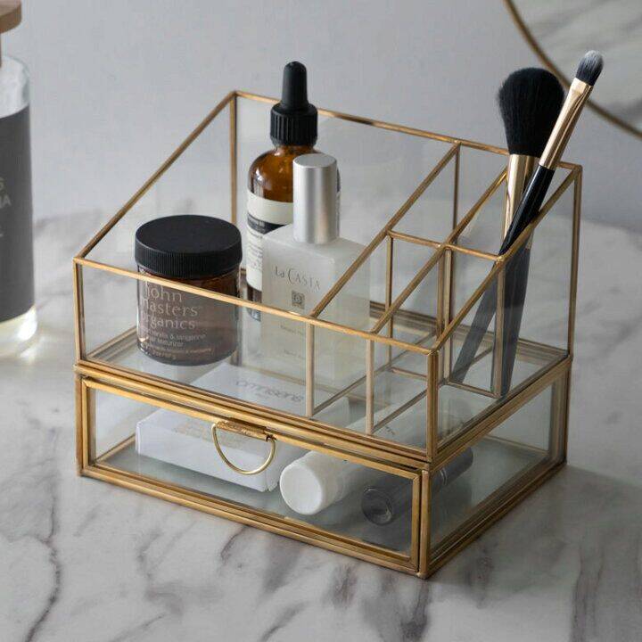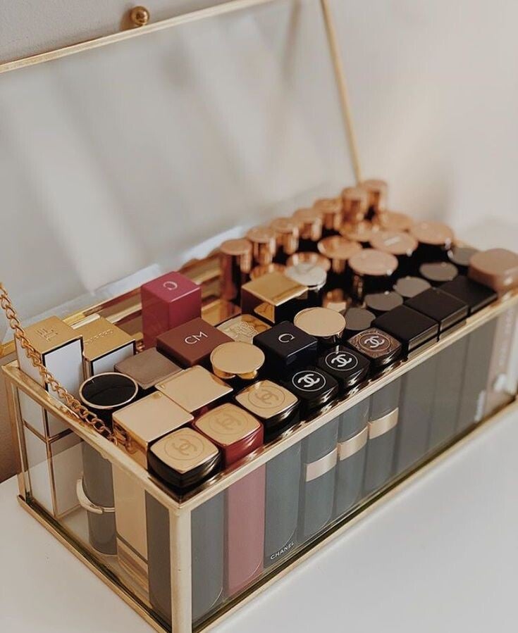 Organizer aus klarem Acryl mit goldenen Kanten oder Einfassungen sind derzeit total im Trend. Sie lassen den Schminktisch aufgeräumt wirken, ohne zu dominant zu sein. Perfekt für Lippenstifte, Lidschattenpaletten oder Parfums. Die transparente Optik sorgt für Übersicht, während das Gold den edlen Touch verleiht.